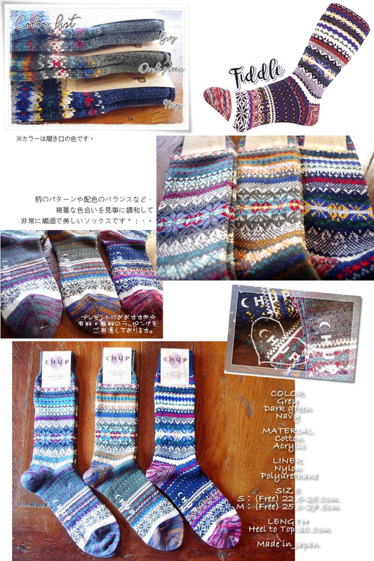 CHUP(チュプ)【数量限定生産】"FIDDLE(フィドル)"フェアアイル柄ソックス(3色)【S/M/メンズ/レディース】【日本製】
