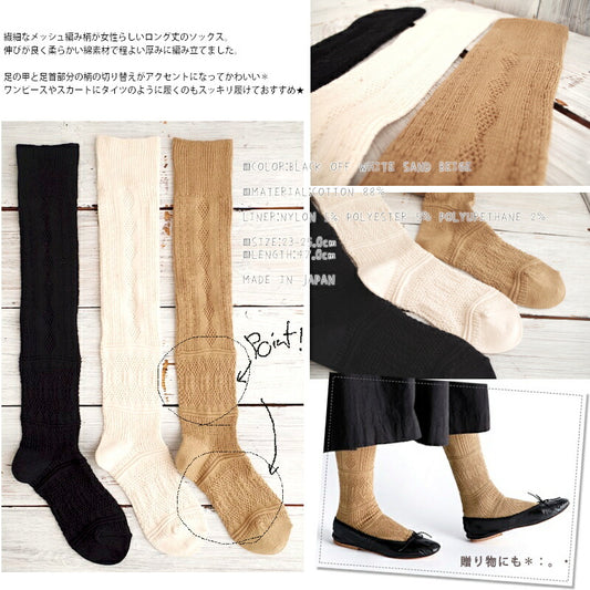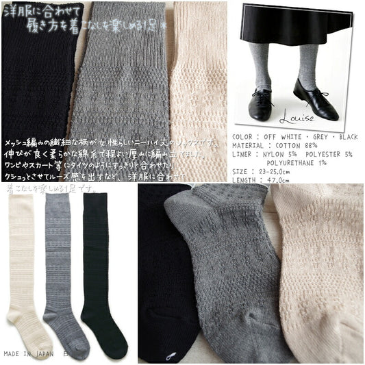 French Bull(フレンチブル)No.11-08221 ルイーズソックス(3色) 【オーバーニー ロング丈 綿コットン メッシュ柄 上品な印象の柄 モチーフ 冷えとり】