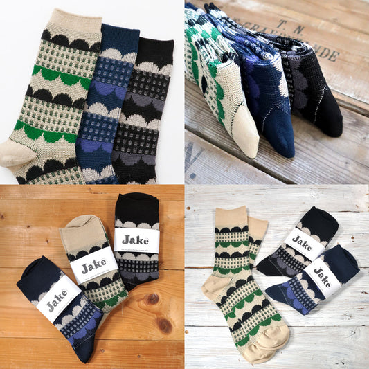 メンズの靴下ブランド〈ジェイク〉です。〈フレンチブル〉や〈シオン〉と同じく天然素材を使い、国内で生産。ちょっとした遊び心と、優しい履き心地を大事にしています。ついついリピートしたくなる、気が付けばまた履いているようなソックス。あげて嬉しい、もらって嬉しいソックス。そんな存在になれば、とても嬉しいです。