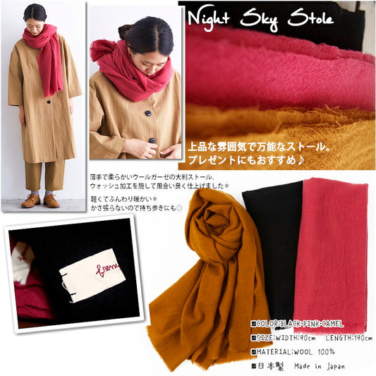 French Bull(フレンチブル)No.17-02202 ナイトスカイストール(3色)【2020年秋冬☆数量限定生産!送料無料!】【無地 ショール 羽織 防寒 冷えとり 冷房対策】【ウール100% 日本製】