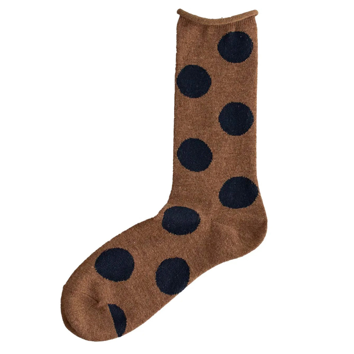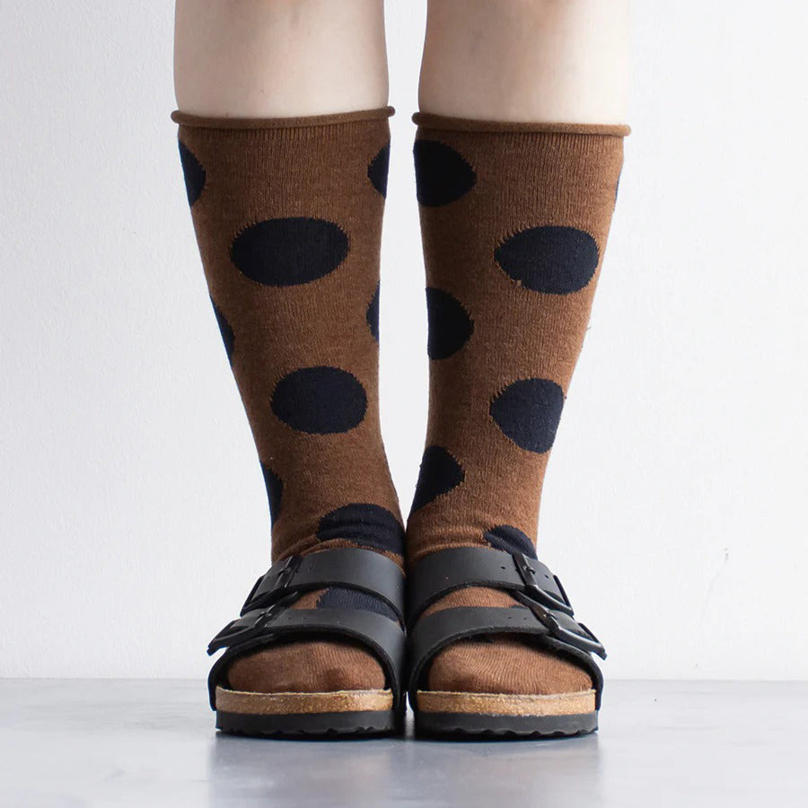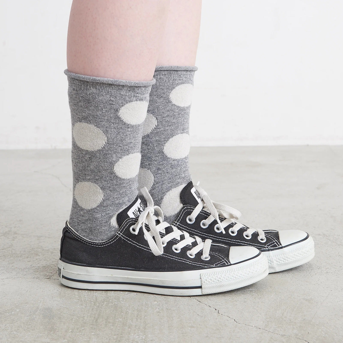 大きめのドットが愛らしい表情のソックスです。履き口はくるっとして締め付けが少ないので気になる方にも◎