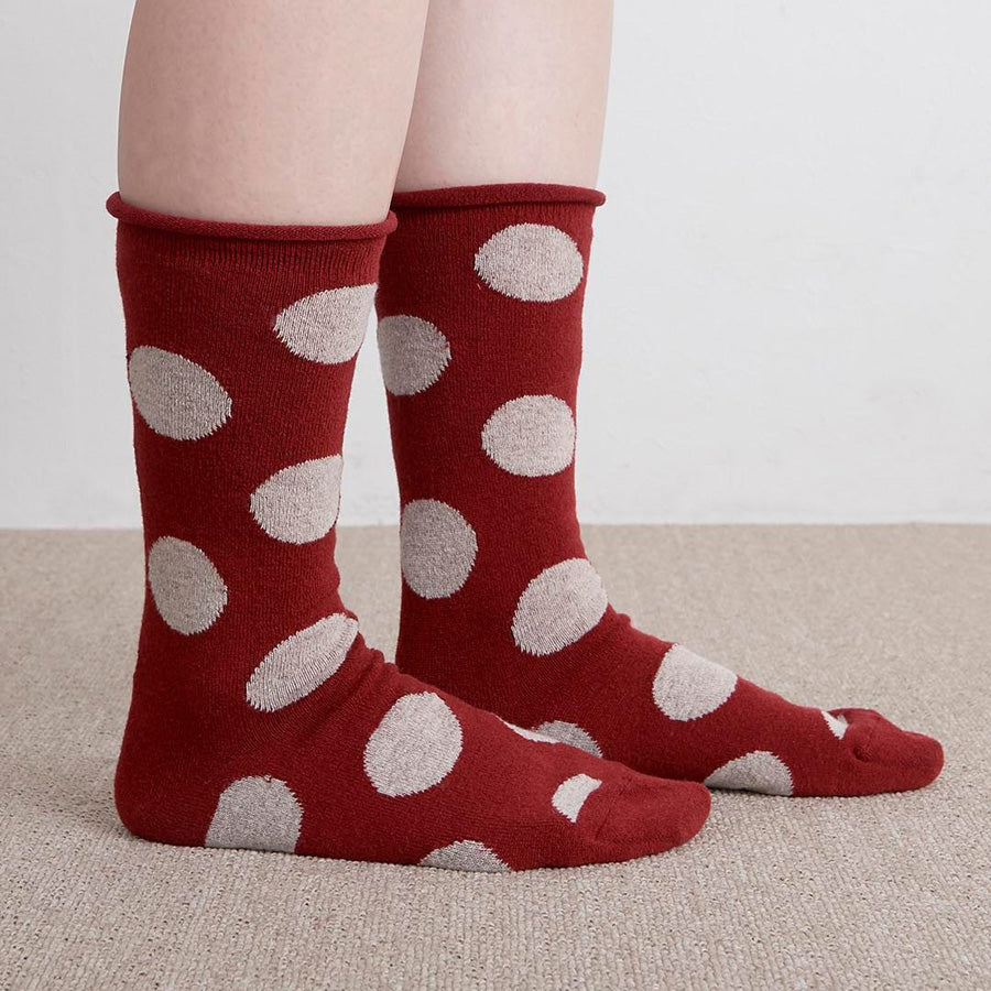 数量限定生産です。大きめのドットが愛らしい表情のソックスです。柔らかいウール素材。