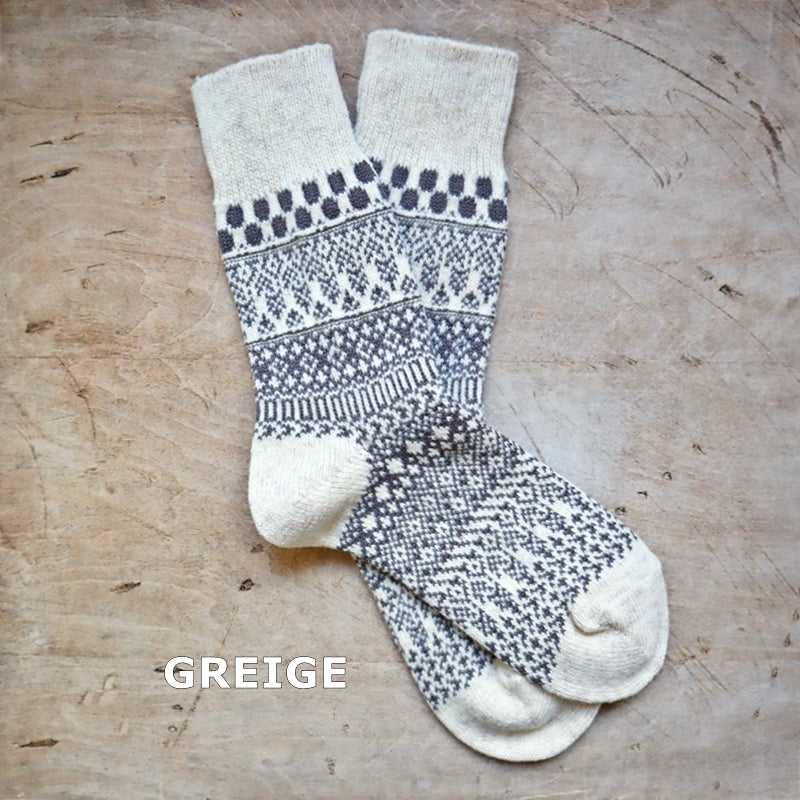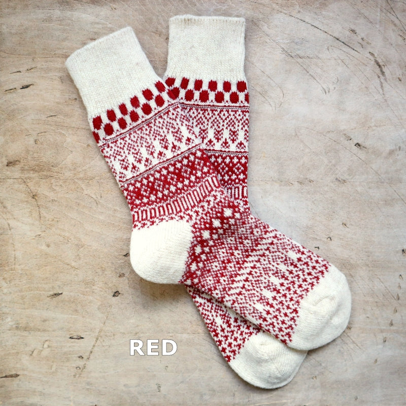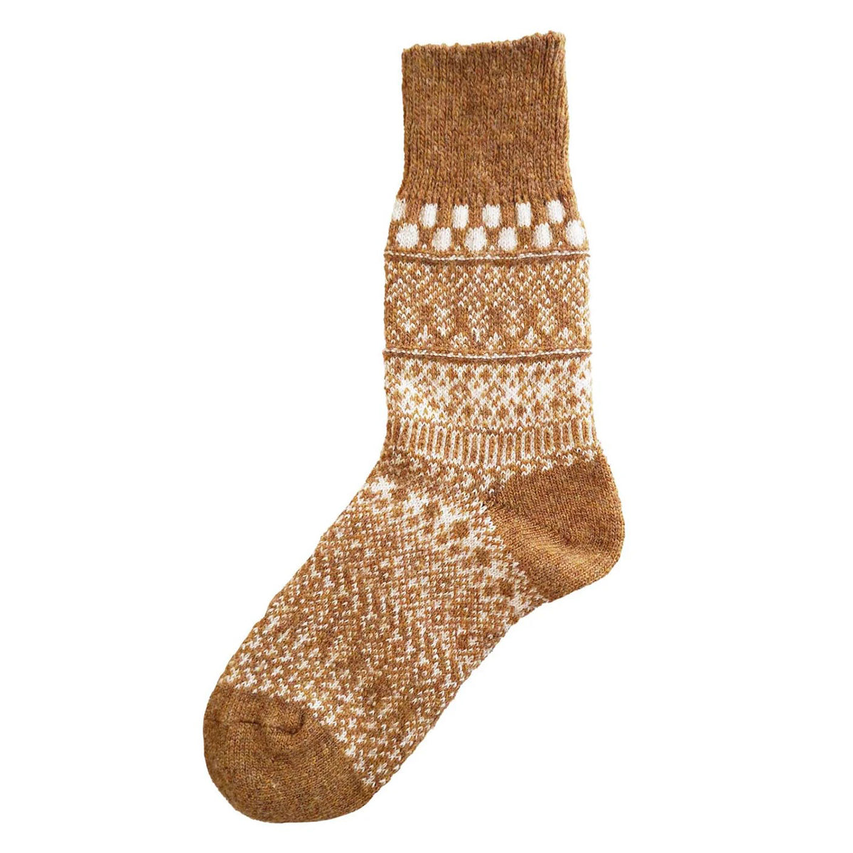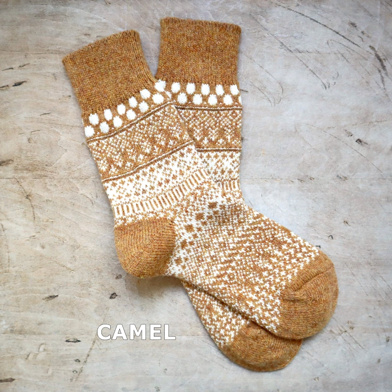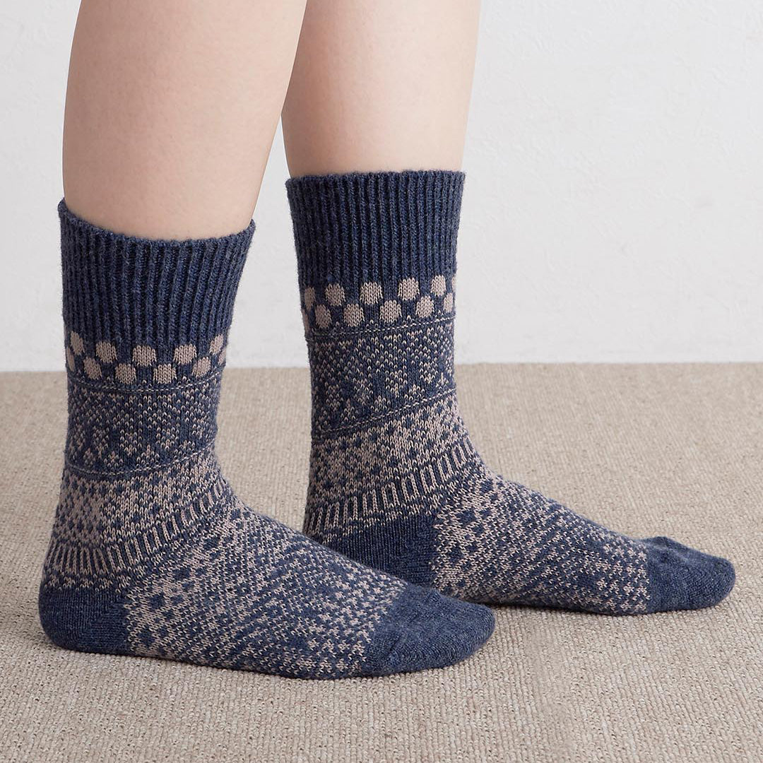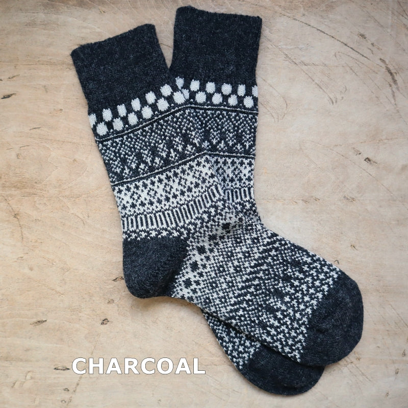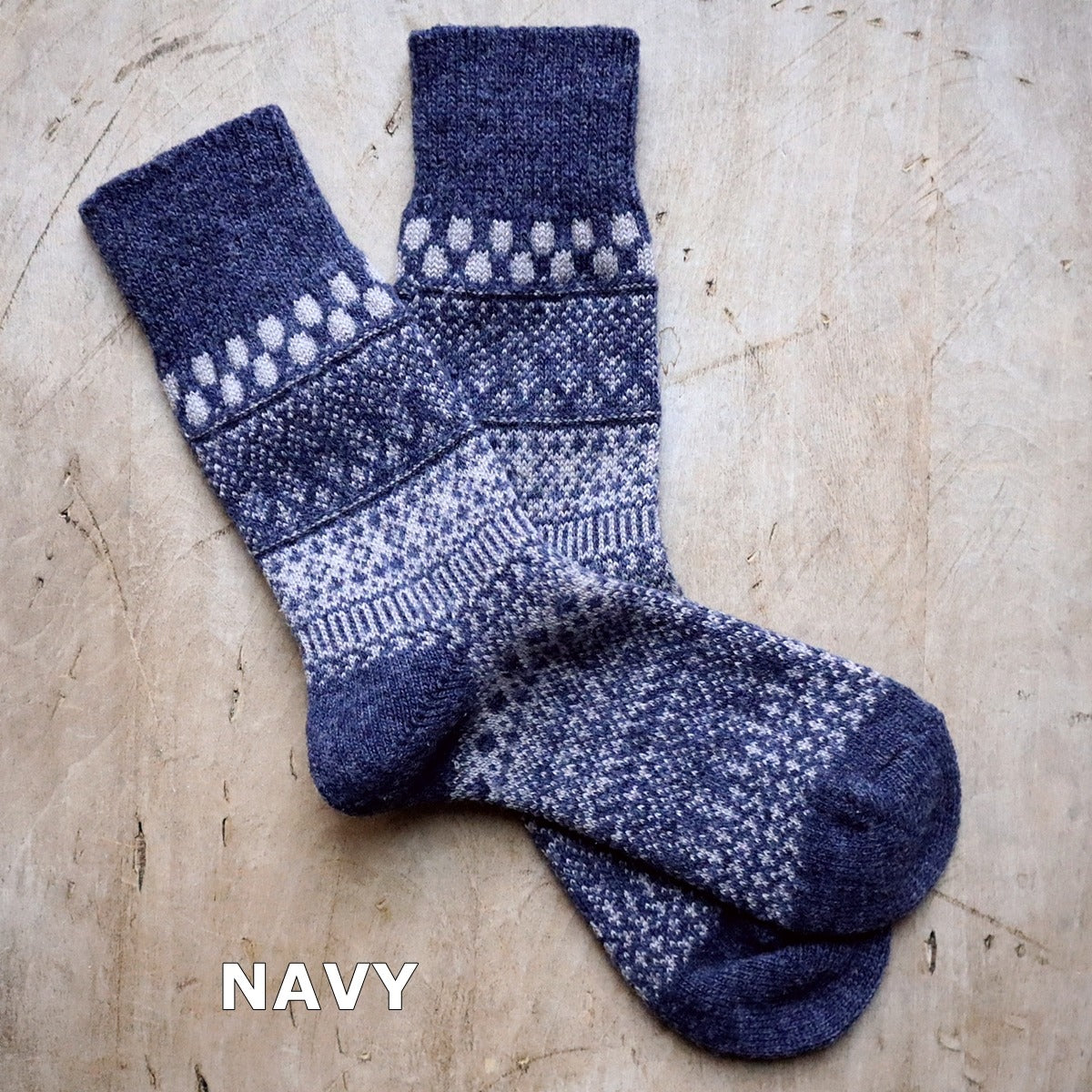繊細なジャガード柄が美しい靴下。ベースは保温性に優れたウール糸、柄糸にはコットン糸を使用。