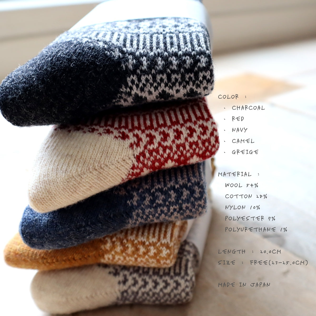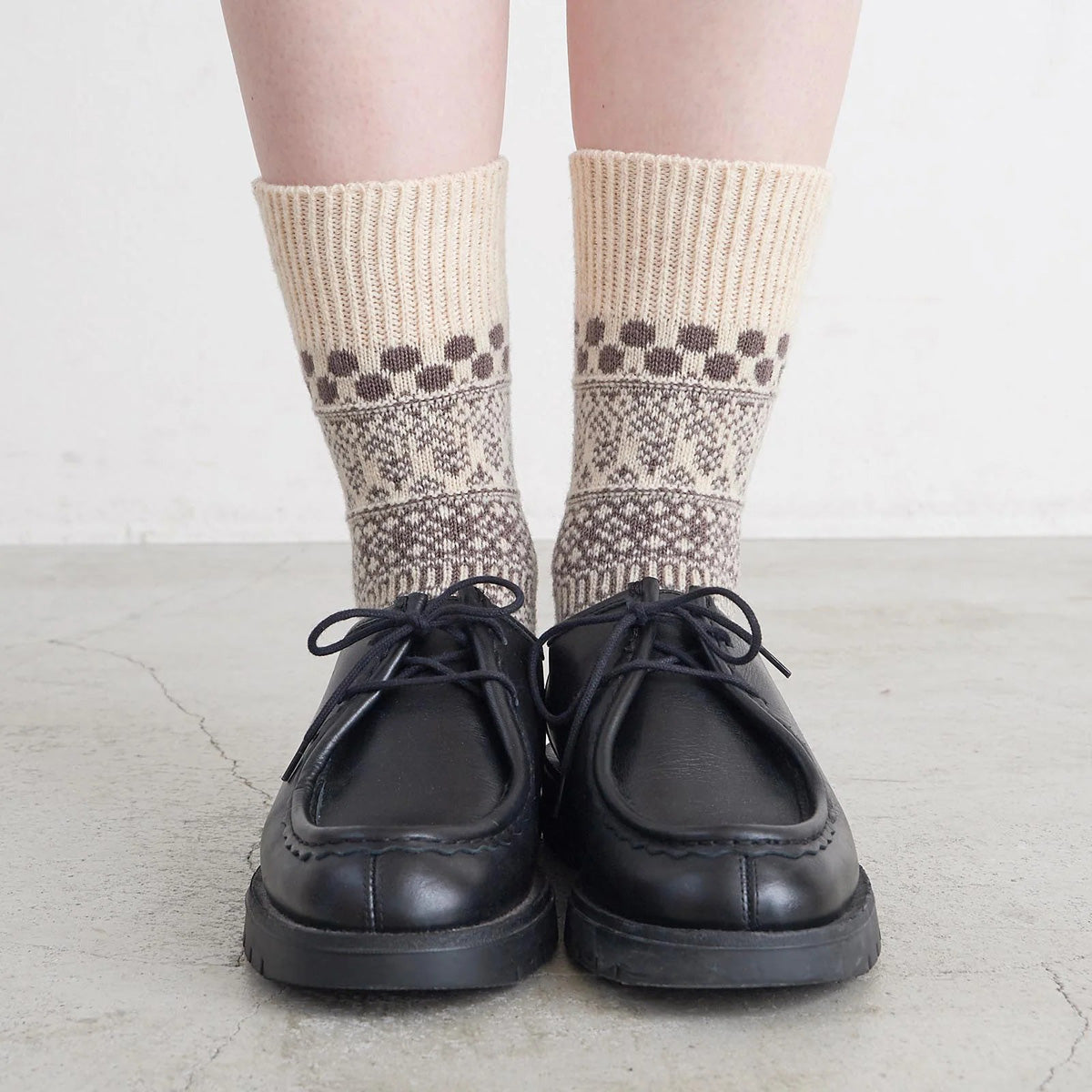 数量限定生産です。繊細なジャガード柄が美しい靴下。ベースは保温性に優れたウール糸、柄糸にはコットン糸を使用。