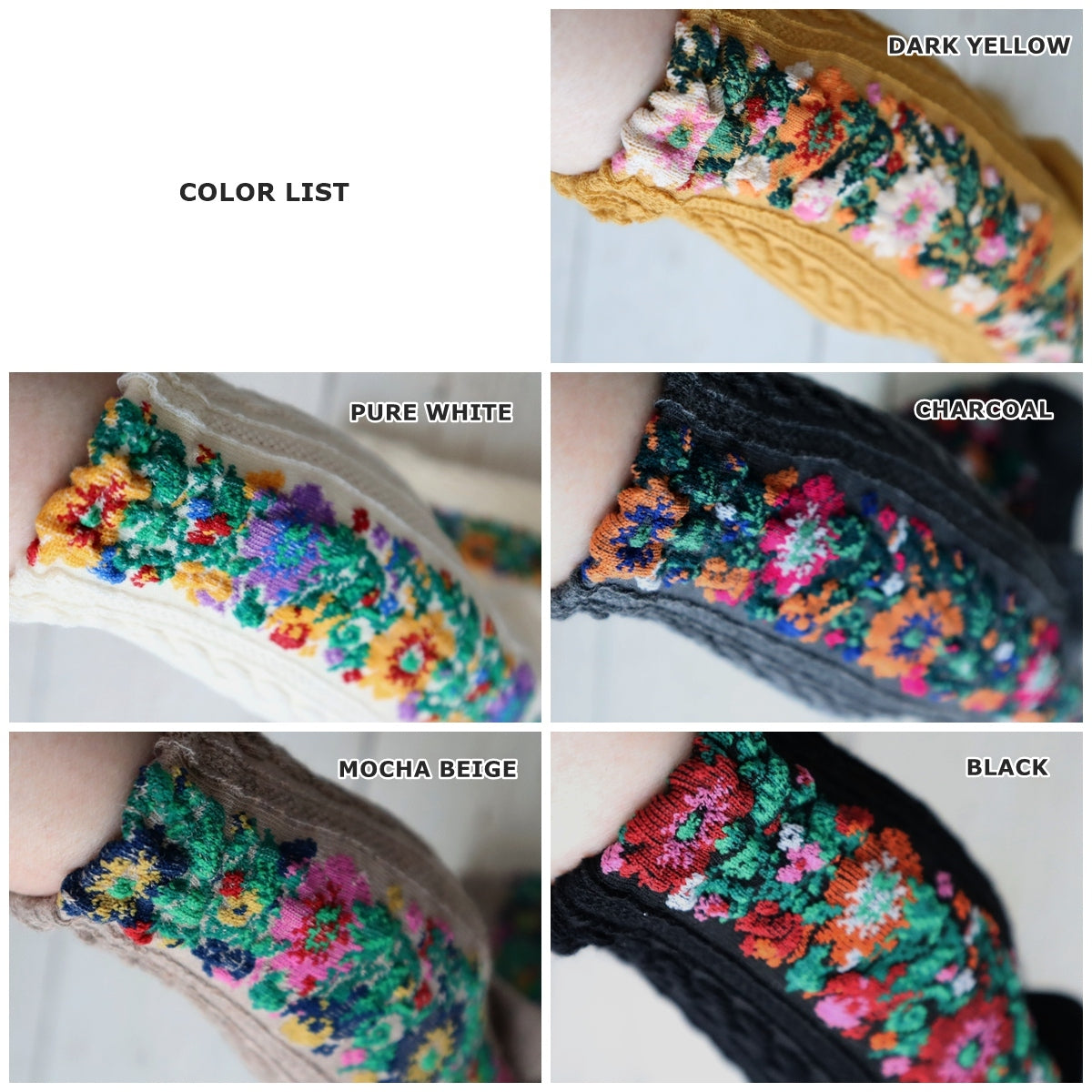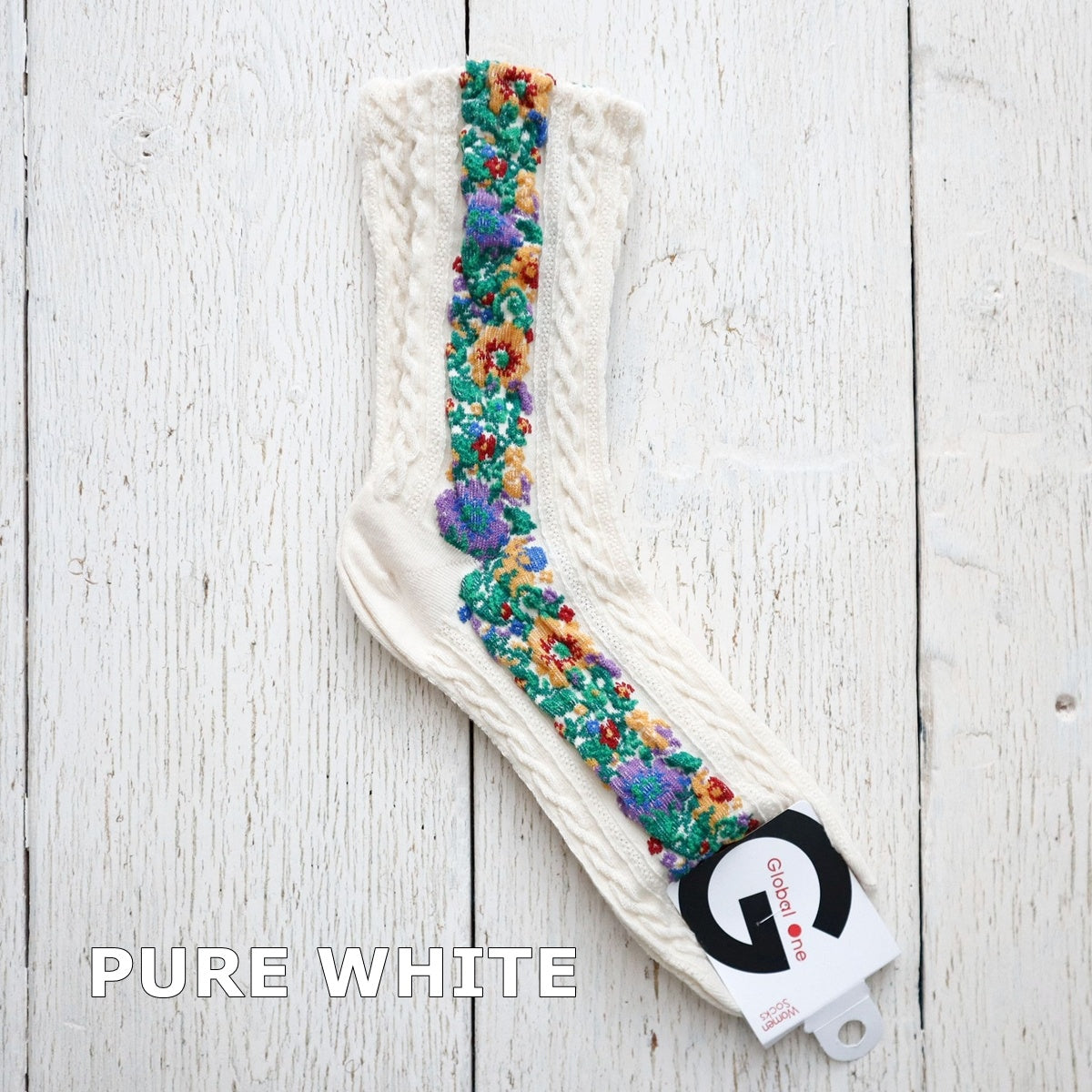 ケーブル編みと履くと程よくフロッキーな花柄がかわいいソックスです。ジャガード編みの凸凹で表現した柄がコーディネートのポイントになる1足。
