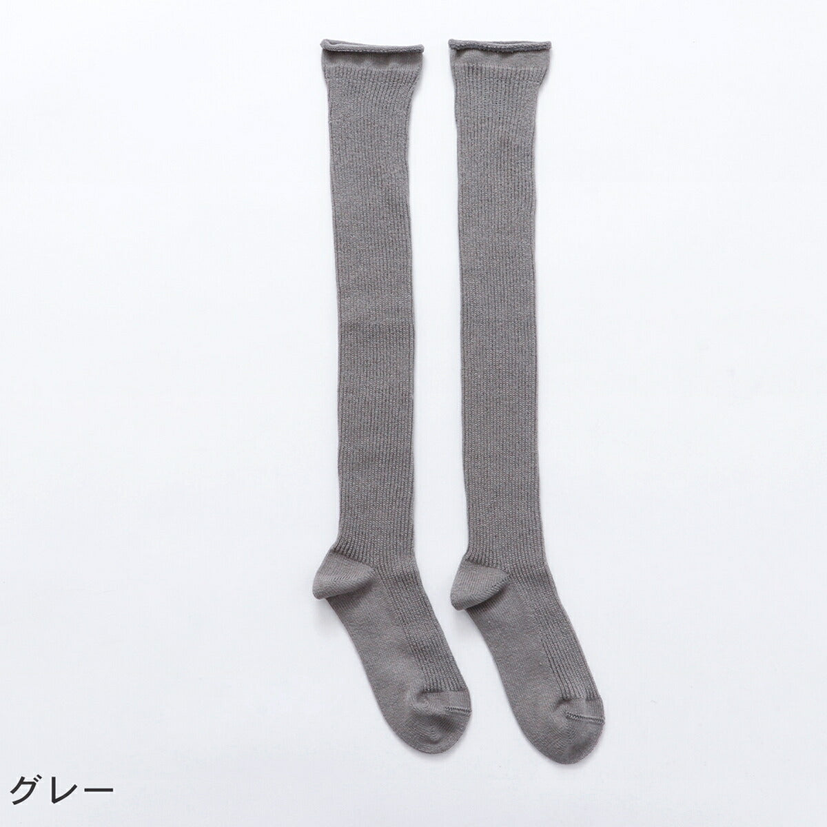 トップのクルクルがポイント☆伸びの良い細リブのオーバーニーソックス。麻混で通気性が良く、通年履いていただけます。