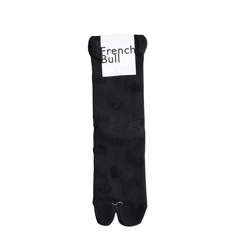 モール糸でドット柄に編み立てた足袋型のソックスです。おしゃれ感があって、コーデのポイントになる1足。