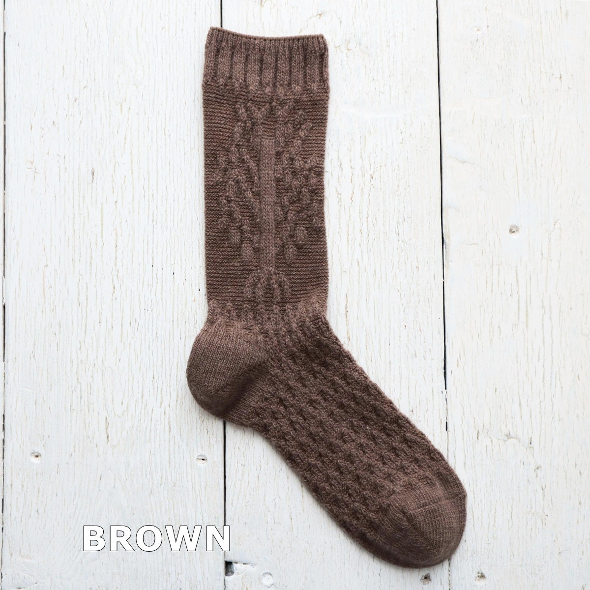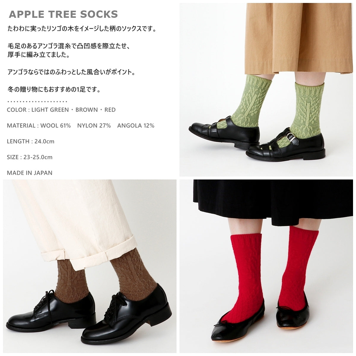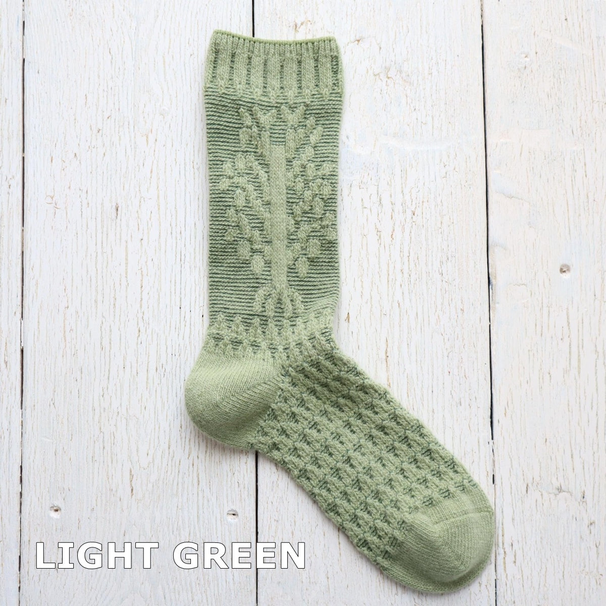 たわわに実ったリンゴの木をイメージした柄のソックスです。アンゴラならではのふわっとした風合いがポイント。冬の贈り物にもおすすめ。