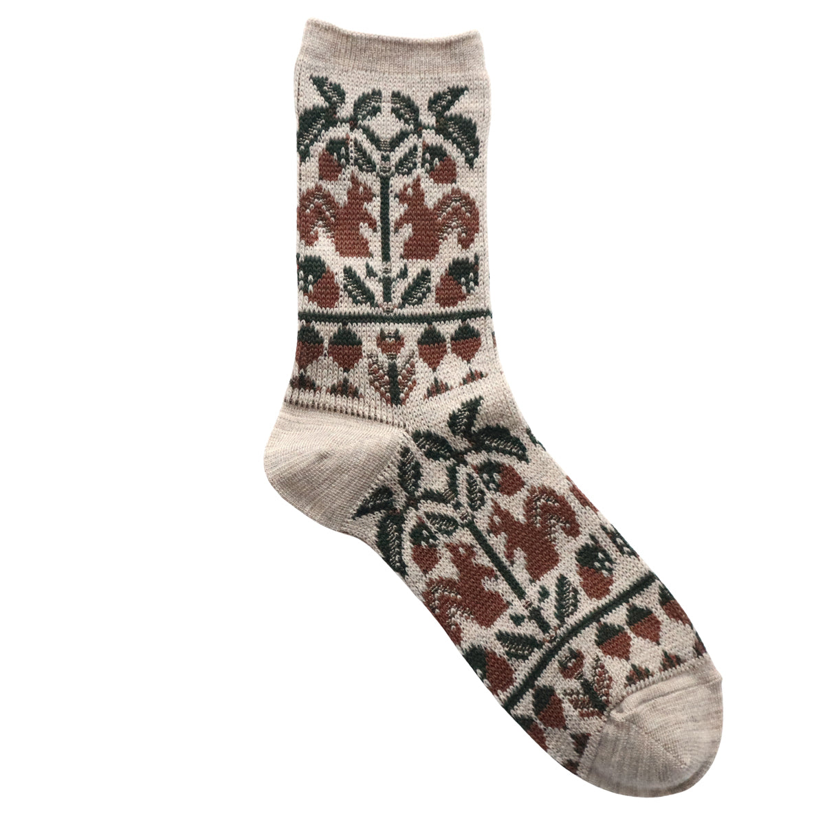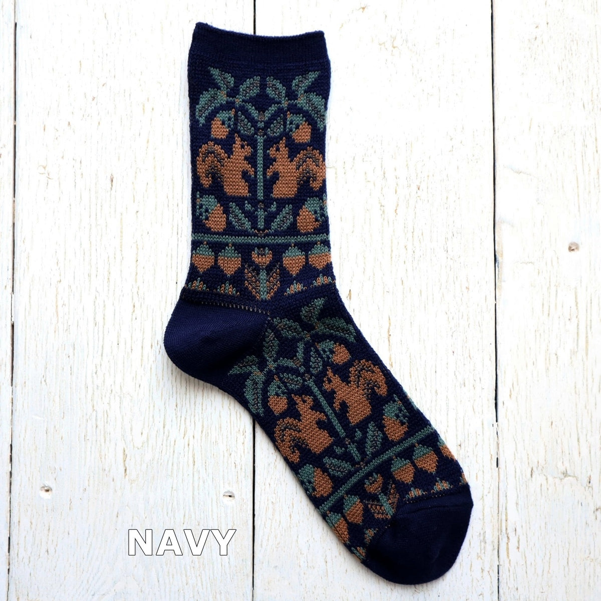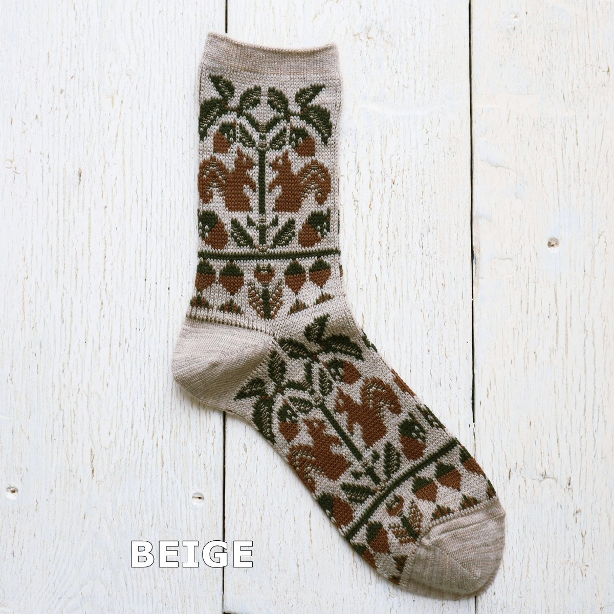 どんぐりの木とリスの柄のソックスです。柔らかく上質なメリノウール糸をベースに程良い厚みに編み立てました。(防縮ウール糸使用)