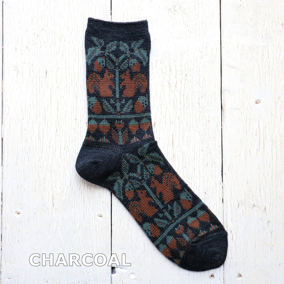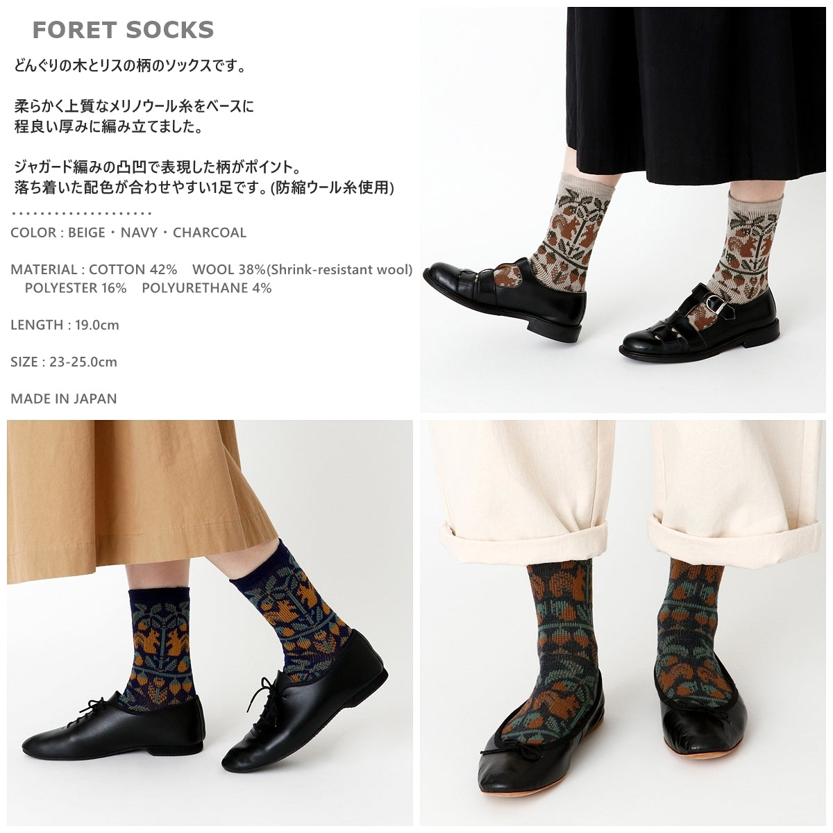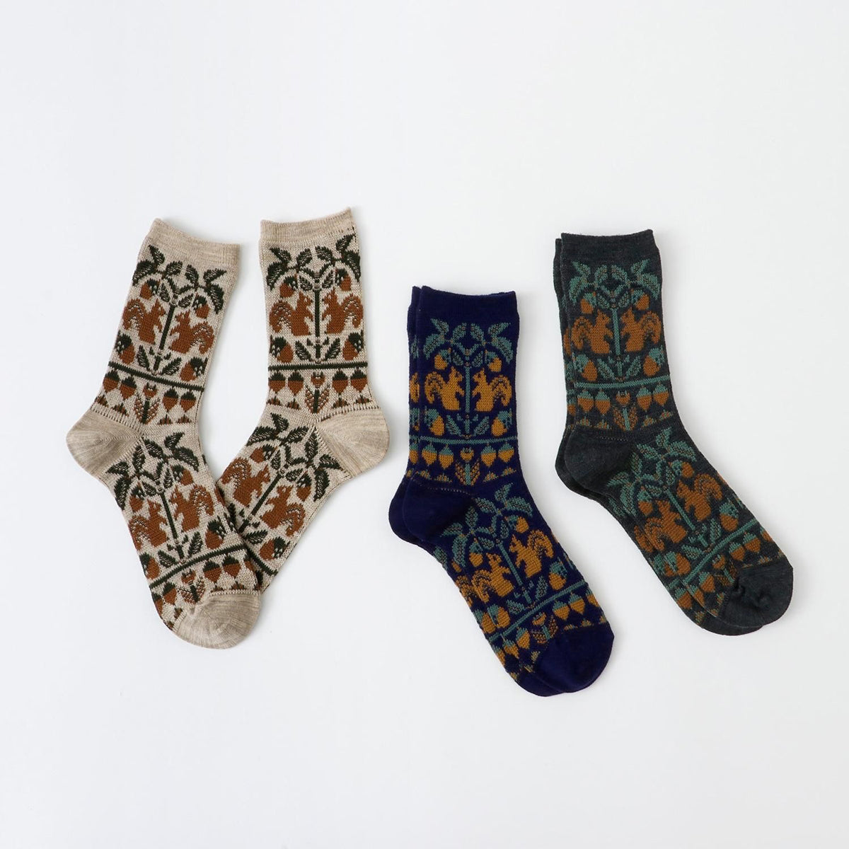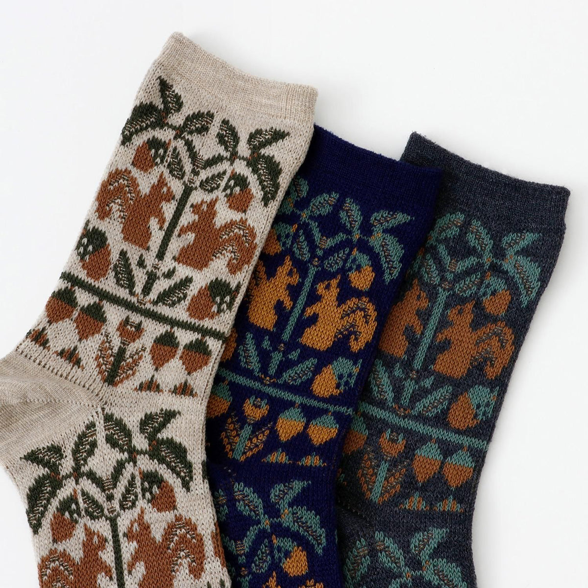 French Bull(フレンチブル)No.11-25259 フォレソックス(3色)【レディース 靴下 日本製 2025-26年秋冬 どんぐりの木とリスの柄 程良い厚み 防縮ウール コットン 贈り物】