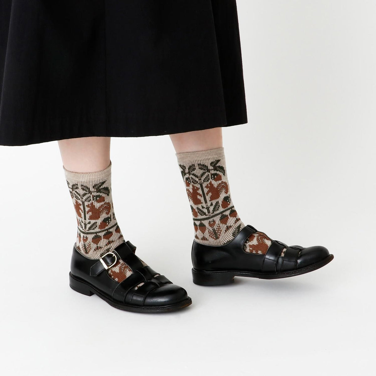 ジャガード編みの凸凹で表現した柄がポイント。落ち着いた配色が合わせやすい1足です。(防縮ウール糸使用)