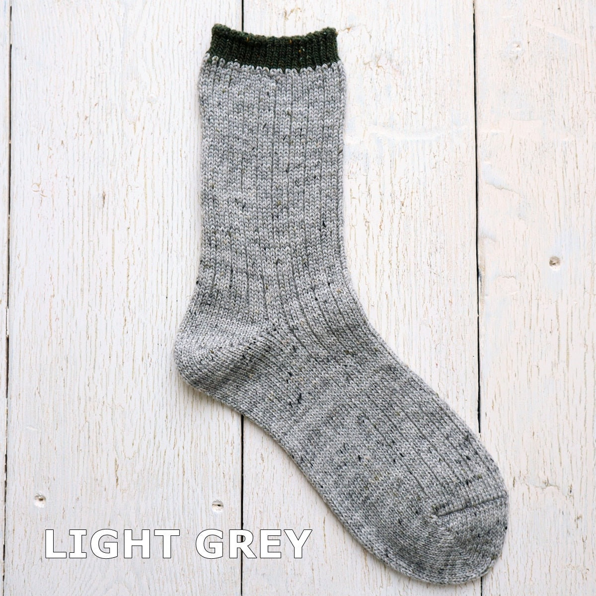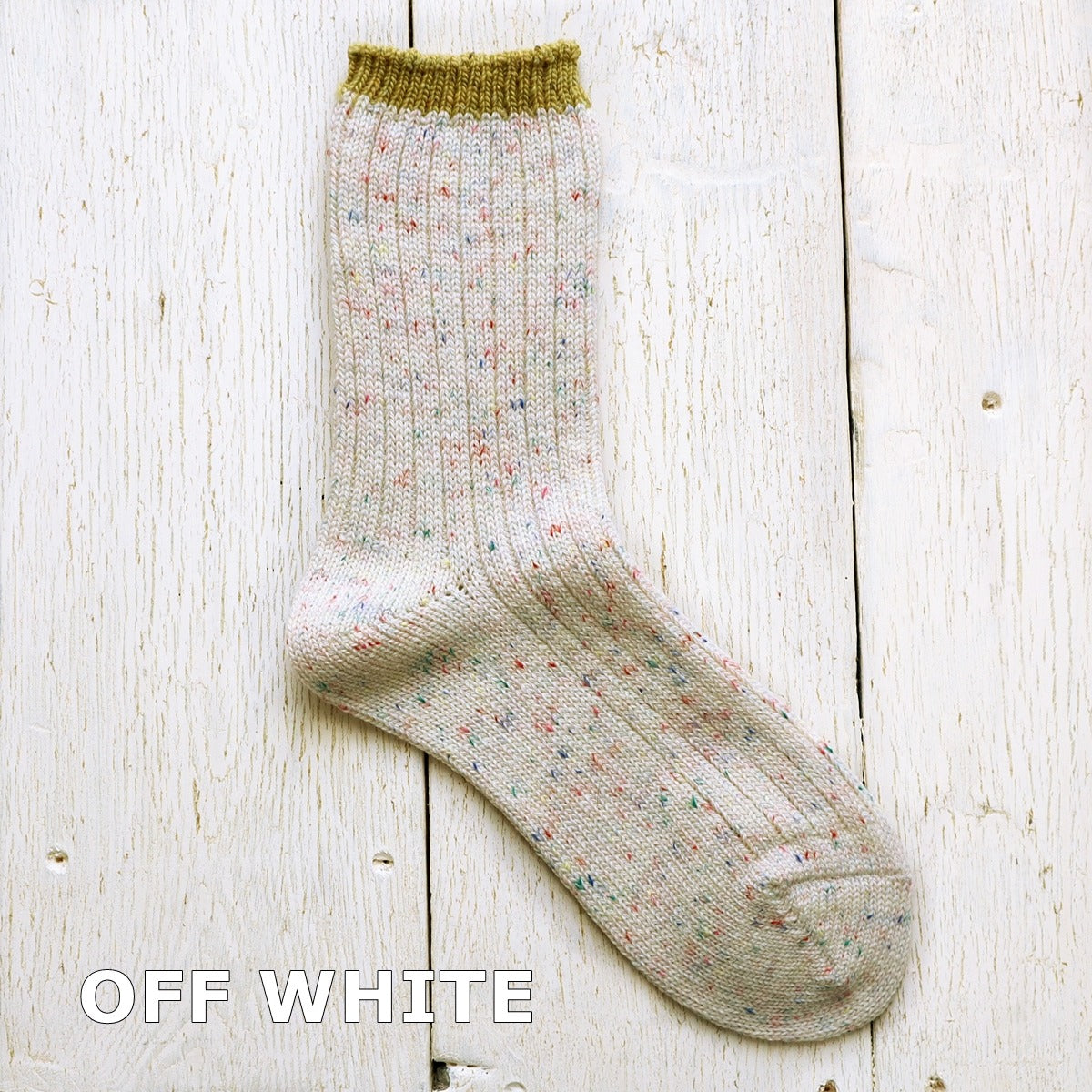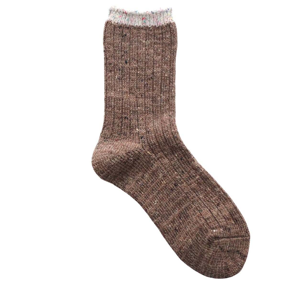カラーネップ糸と防縮ウールをMIXして編み立てTOPに別色を施したソックス。