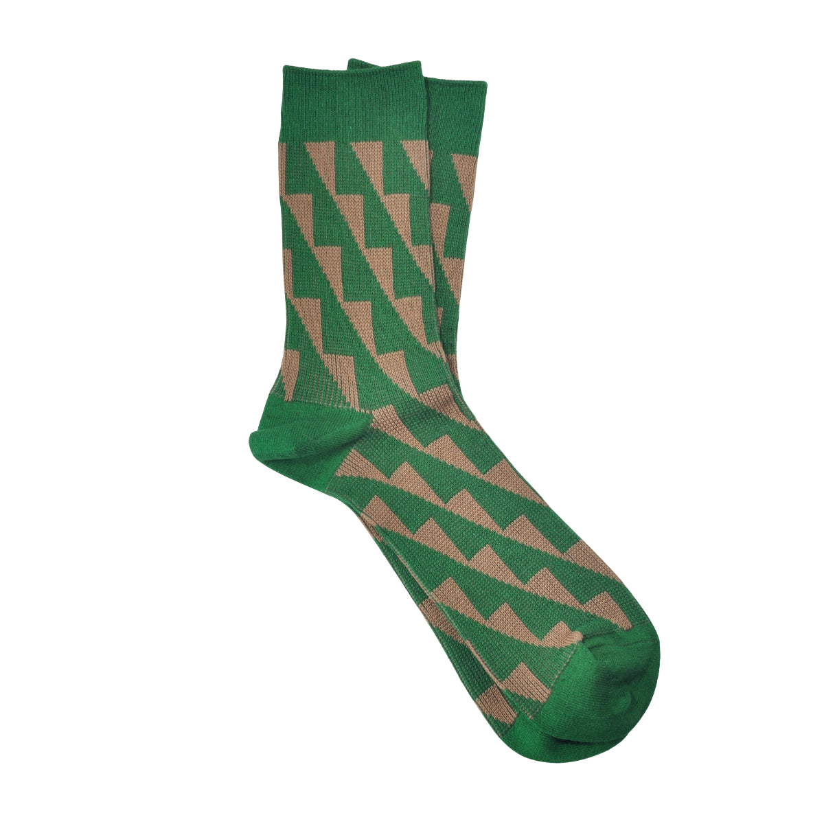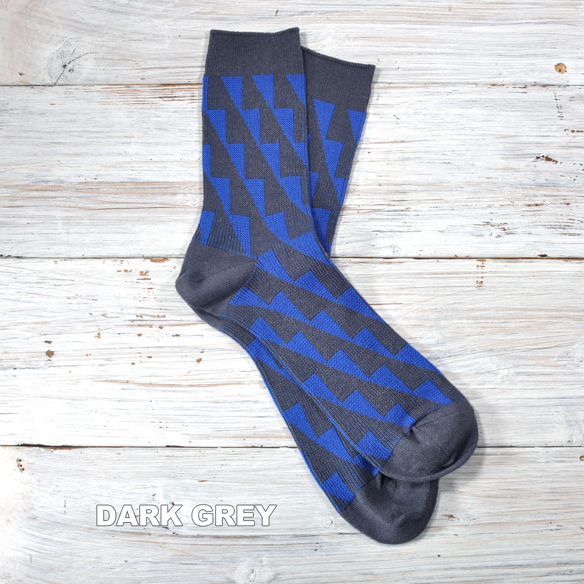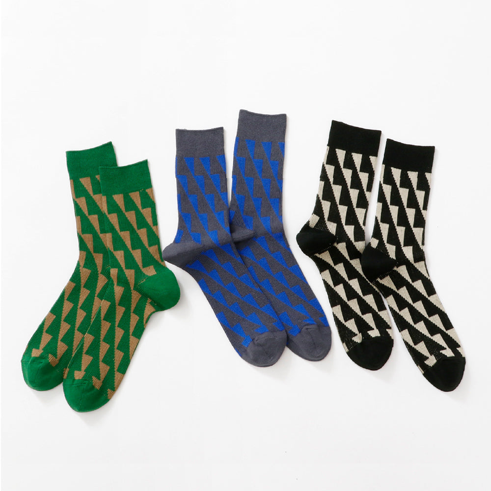幾何学柄のジャガード編みのソックスです。ベースはガス焼処理により毛羽を抑えたシルケットの綿糸で、程よい厚みに編み立てました。シャープな柄と配色が目を引き、鮮やかなカラーは差し色としても。カジュアルスタイルに合わせやすい1足です。