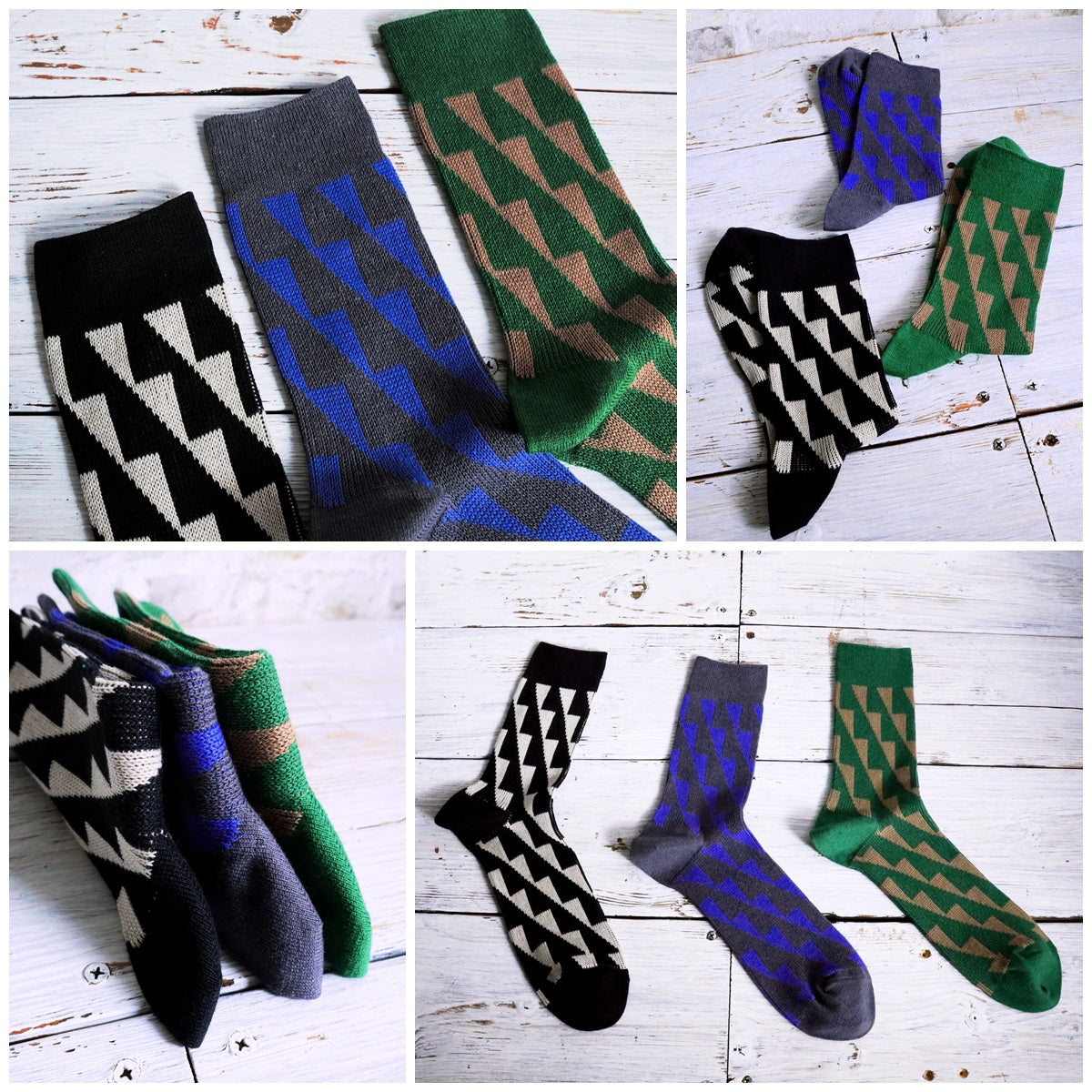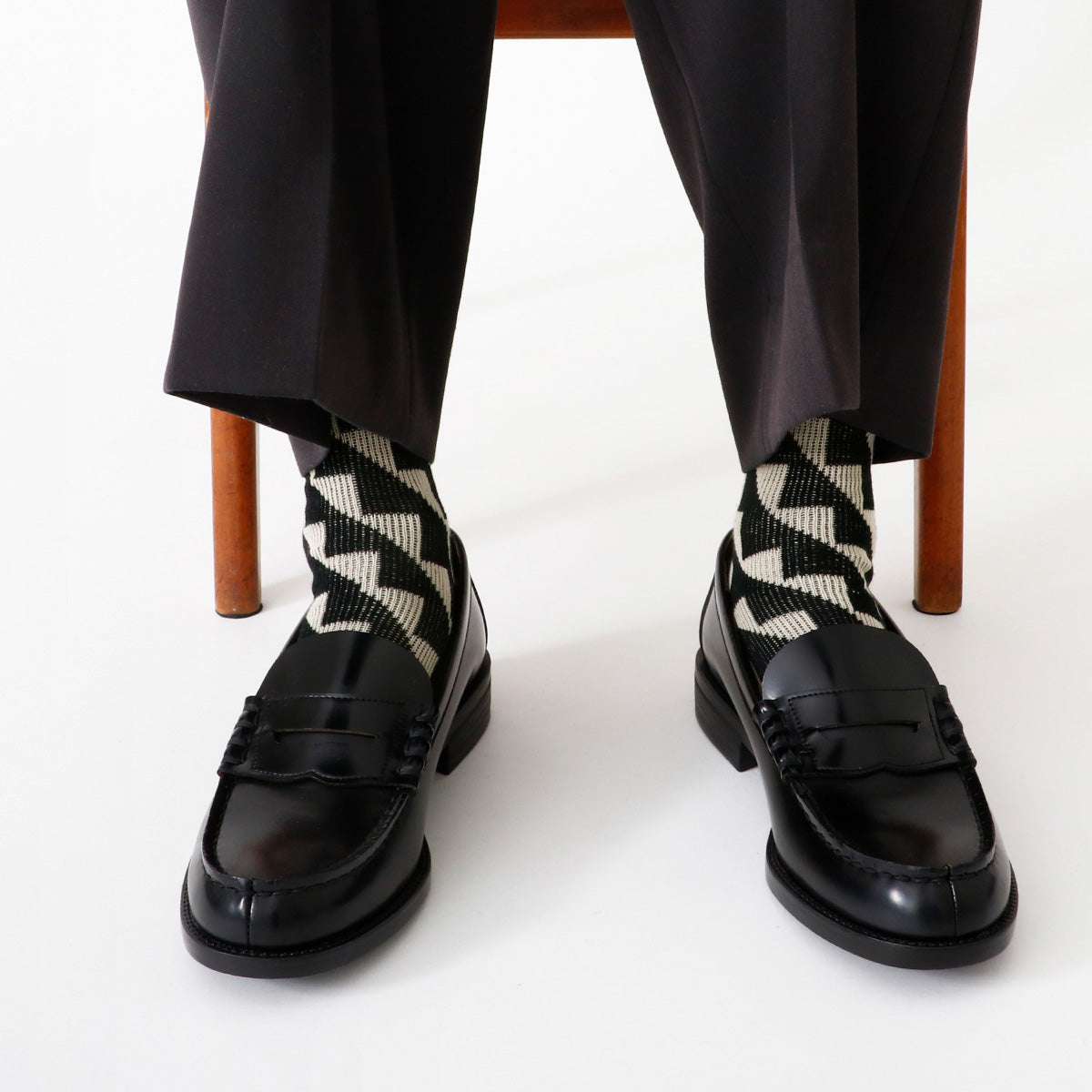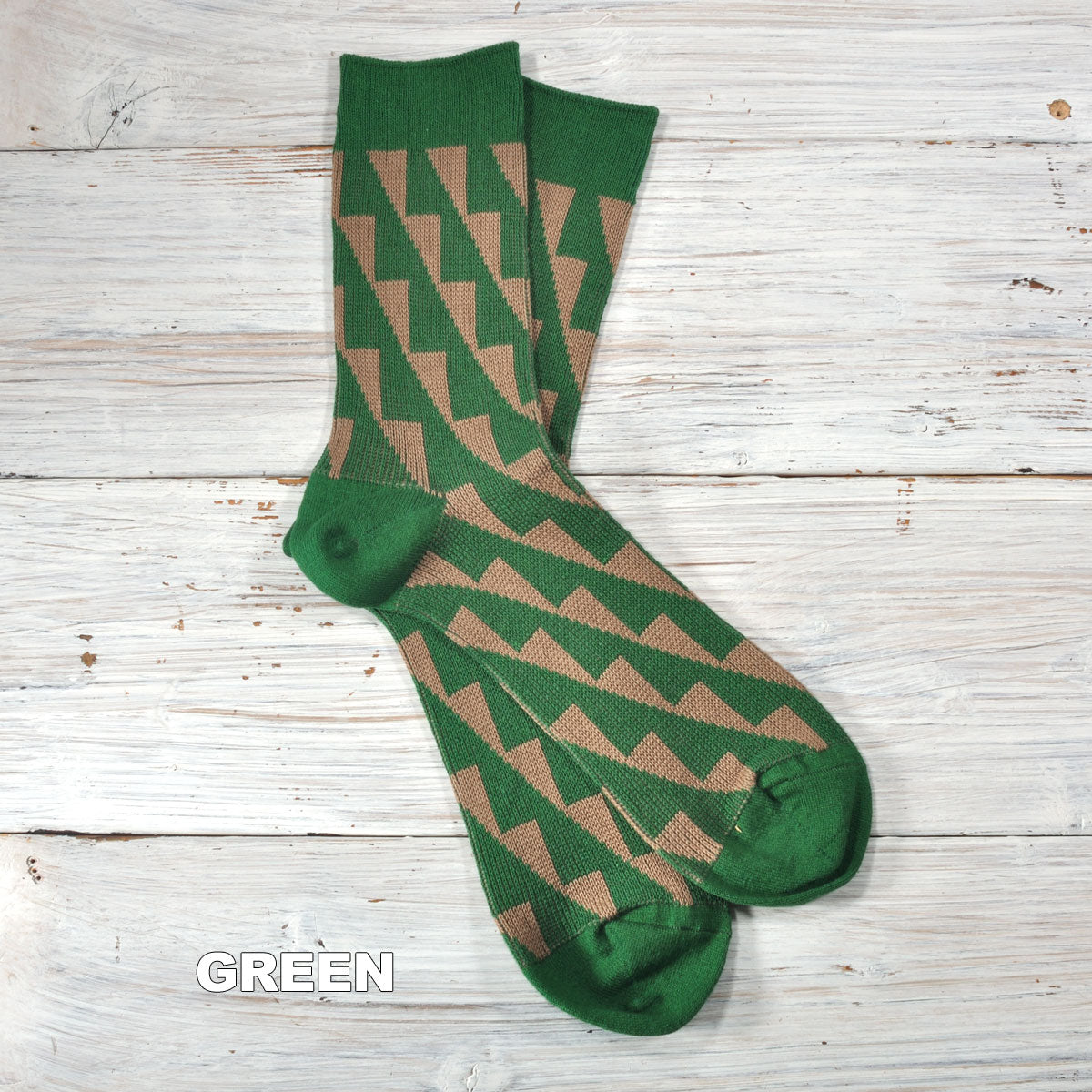 幾何学柄のジャガード編みのソックスです。ベースはガス焼処理により毛羽を抑えたシルケットの綿糸で、程よい厚みに編み立てました。シャープな柄と配色が目を引き、鮮やかなカラーは差し色としても。カジュアルスタイルに合わせやすい1足です。